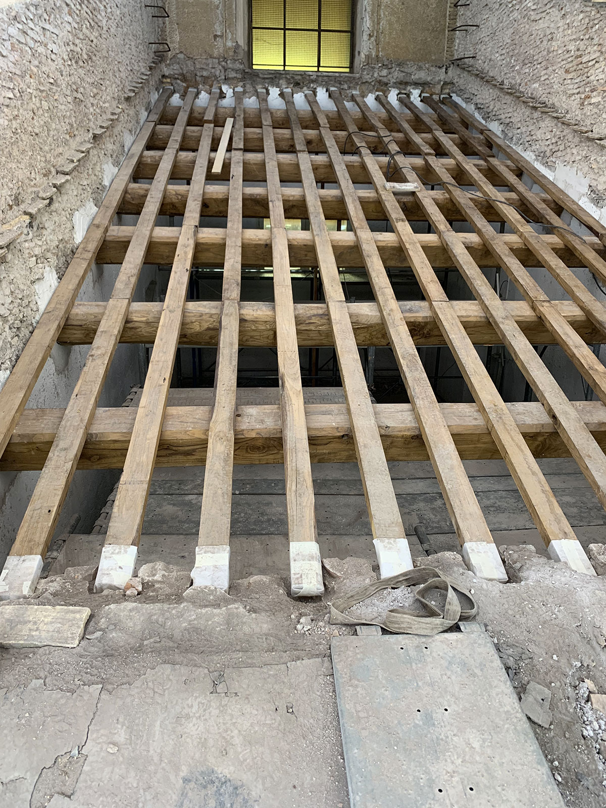 Ѐ stato poi realizzato un piano di irrigidimento in compensato collegato ai travetti e alla muratura perimetrale, con i primi mediante viti strutturali e con la seconda mediante barre in acciaio inox filettate. L’intero intervento aveva lo scopo di ottimizzare la ripartizione dei carichi e di migliorare l’efficienza dell’intera struttura in caso di evento sismico.